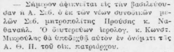 Τέλος, στο φύλλο 7340 της Πέμπτης 3/15.2.1894 αναφέρεται ότι έφτασε προχθές (Τρίτη 1/13.2.1894) «ο εκ των νέων συνοδικών σεβ. Προύσης κ. Ναθαναήλ», τον οποίο υποδέχθηκε ο ιερολ. δευτερεύων κ. Κ. Μικρούλης εν ονόματι Α.Θ.Π. του οικουμ. πατριάρχου. Ο άγιος Προύσης, πήγε στο Φανάρι και επισκέφθηκε τον Οικουμενικό Πατριάρχη. Την ίδια ημέρα ανέλαβε τα νέα του καθήκοντα αναπληρώσας τον άγιο Δέρκων κ. Καλλίνικο.