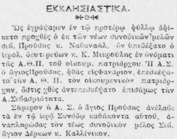 Σήμερον η Α. Σ. ο άφιος Προύσης ανέλαβε τα εν τη ιερά Συνόδω καθήκοντα αυτού, αναπληρώσας τον τέως συνοδικόν μέλος Σεβ. άγιον Δέρκων κ. Καλλίνικον.