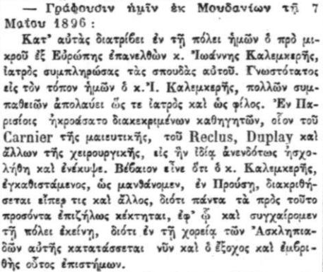 Κατ' αυτάς διατρίβει εν τη πόλει ο από μικρού εξ Ευρώπης επανελθών κ. Ιωάννης Καλεμκερής, Ιατρός συμπληρώσας τας σπουδάς αυτού Γνωστότατος εις τον τόπον ημών ο κ. Ι. Καλεμκερής, πολλών συμπαθειών απολαύει ως τε ιατρός και ως φίλος. Εν Παρισίοις ηκροάσατο διακεκριμένων καθηγητών, οίον του Carnier της μαιευτικής, του Reclus, Duplay και άλλων της χειρουργικής, εις ήν ιδία ανενδότως ησχολήθη και ενέκυψε. Βέβαιον είνε ότι ο κ. Καλεμκερής, εγκαθιστάμενος, ως μανθάνομεν, εν Προύση, διακριθήσεται είπερ τις και άλλος, διότι πάντα τα προς τούτο προσόντα επιζήλως κέκτηται, εφ ώ και συγχαίρομεν τη πόλει εκείνη, διότι εν τη χορεία των Ασκληπιαδών αυτής κατατάσσεται νυν και ο έξοχος και εμβριθής ούτος επιστήμων.