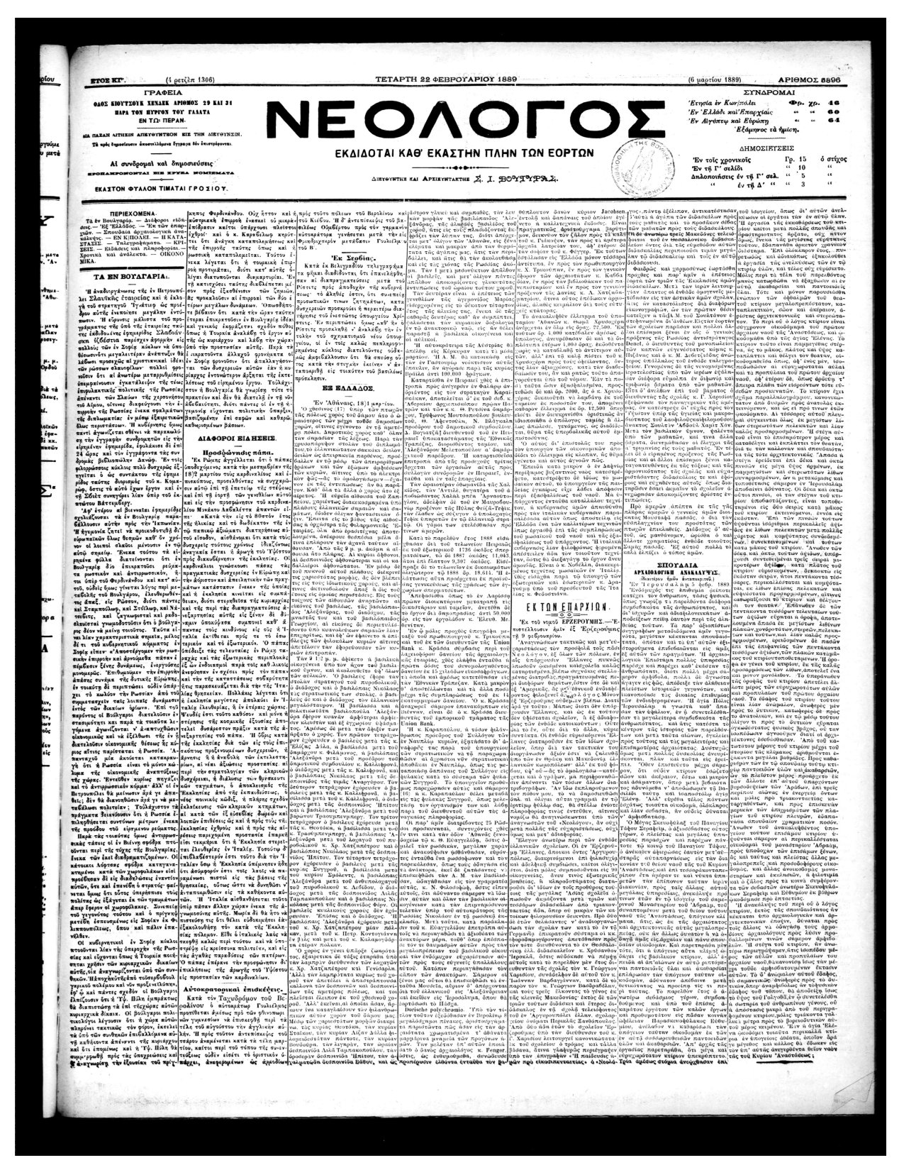 ΝΕΟΛΟΓΟΣ φύλλο 5896 της Τετάρτης 22.2/6.3.1889 (1η σελ. 151)