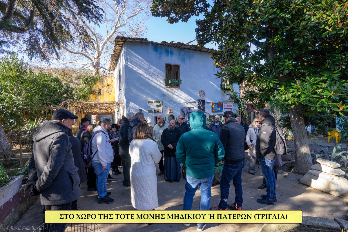 Μετά περάσαμε απέναντι. Είναι η μονή Μηδικίου. Για την ακρίβεια ο,τι απέμεινε. Μόνον ο εξωτερικός περίβολος. Τα σκυλιά του ιδιοκτήτη, αναστατώθηκαν από την παρουσία μας και  τον ανάγκασαν να έρθει στην είσοδο. Μας επέτρεψε να περάσουμε την μεγάλη πόρτα που παραμένει η ίδια από τότε. Κι εδώ δεν έχει μείνει κάτι. Ένα από τα σημαντικότερα μοναστήρια της Τρίγλιας, η Μονή Μηδικίου ή Μονή των Πατέρων με σημαντικότατη ιστορία έχει γκρεμιστεί. Ο χώρος, στα χρόνια που πέρασαν ήταν κατοικία, ήταν μπαρ, ήταν χώρος ιδιωτικός.
