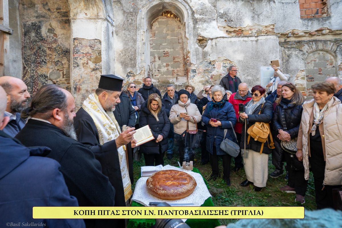 Συνεχίσαμε βαδίζοντας προς το ναό της Παντοβασιλίσσης. Αγοράσθηκε πριν λίγα χρόνια από το Οικομενικό Πατριαρχείο, όμως αν δεν γίνουν άμεσα εργασίες συντήρησης, είναι σίγουρο πως ξαφνικά, θα καταρρεύσει. Ξεκλειδώσαμε τη πρόχειρη σιδερένια είσοδο και περάσαμε στο εσωτερικό του. Οι τοιχογραφίες φαίνοται καθαρά. Το ιερό στέκει ακόμη. Τέσσερεις κίονες με πρόχειρα ξύλινα δοκάρια στηρίζουν ακόμη τον τρούλο. Η σκεπή έχει καταρρεύσει. Ο μητροπολίτης Προύσης και ο πατέρας Δημήτριος φορέσανε τα άμφια. Οι πιστοί σχημάτισαν ένα ημικύκλιο. Είχαμε και επισκέπτες, σημερινούς κατοίκους της Τρίγλιας. Η βασιλόπιττα τοποθετήθηκε στο μικρό τραπεζάκι που μεταφέραμε. Παρά το τσουχτερό κρύο, η ατμόσφαιρα στις καρδιές μας ήταν ζεστή. Ψάλαμε όλοι. Ο μητροπολίτης έκοψε τη βασιλόπιττα. Ευλογία!