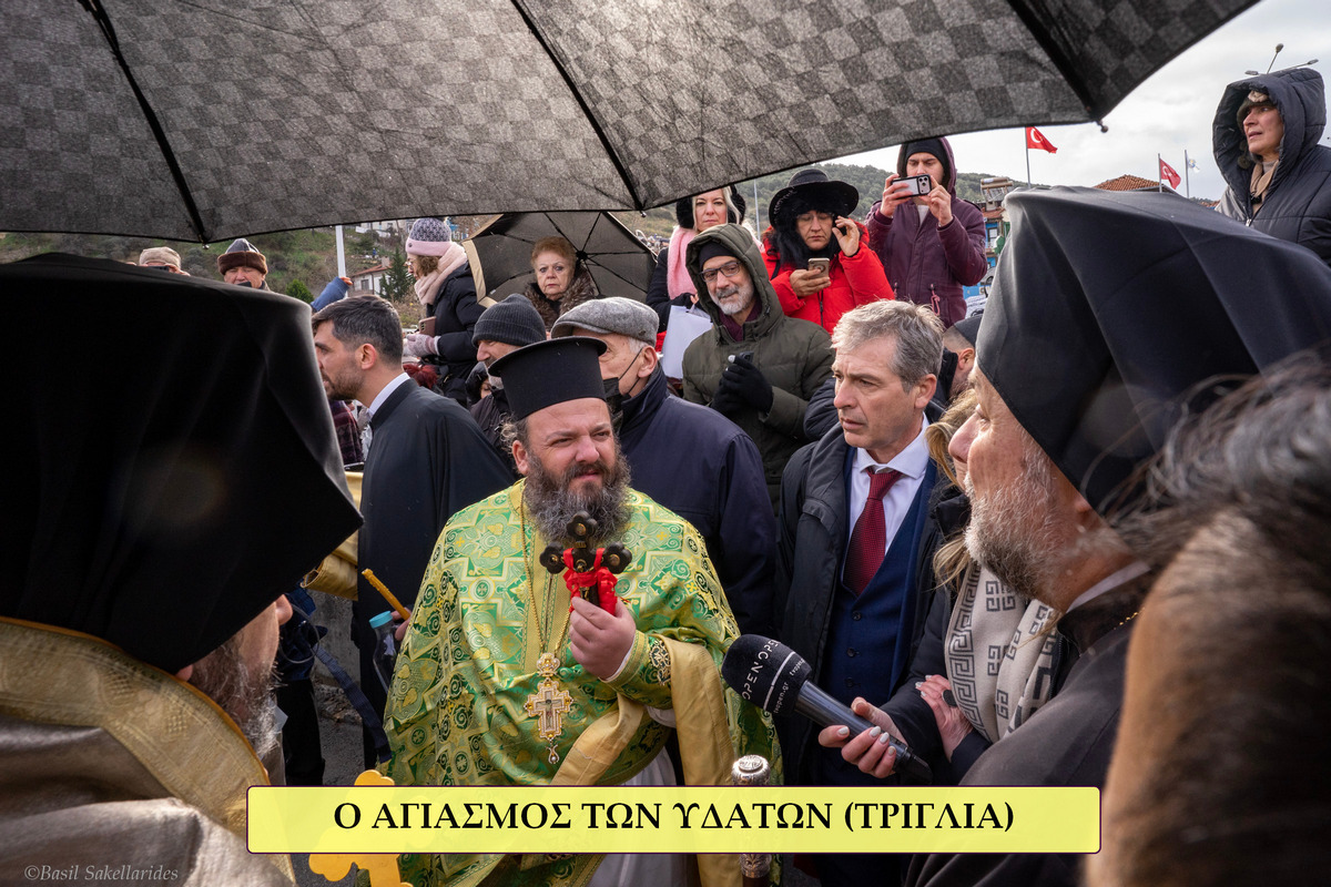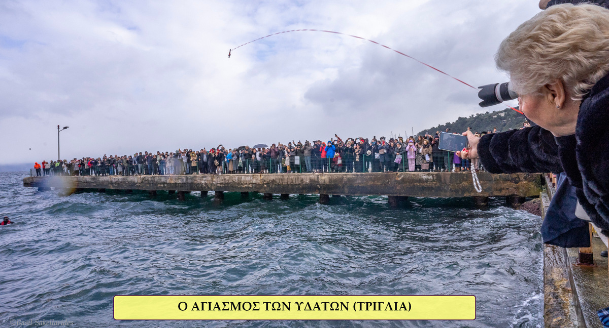 Με το τέλος της ακολουθίας, η πομπή κατευθύνθηκε από τον κεντρικό δρόμο (τον ντερέ) ψάλλοντας σε όλη τη διαδρομή προς το λιμάνι. Πλήθος πιστών ακολουθούσε.  Το έντονο κρύο δεν εμπόδισε τους τολμηρούς κολυμβητές (έξι άνδρες και μια γυναίκα) που περίμεναν στο πλοιάριο. Ο ιερέας πέταξε μακρυά το σταυρό, που ήταν δεμένος με μια κόκκινη κορδέλα. Ο πρώτος κολυμβητής που τον έπιασε αφού τον ασπάσθηκε, τον έδωσε και στους άλλους. Τα ύδατα αγιάσθηκαν. Ευλογία.